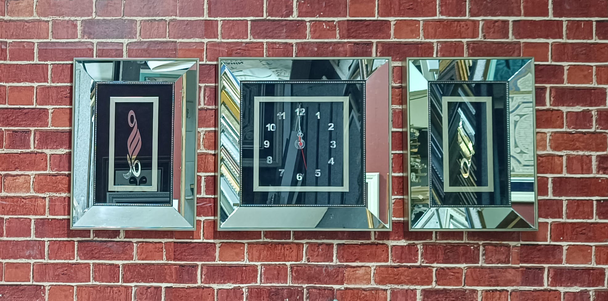 Ortasında saat yanlarda ALLAH MUHAMMED Lafzı. Aralarında 5 er cm boşluk bırakılınca dış ölçüsü boy 51cm en 154 cm